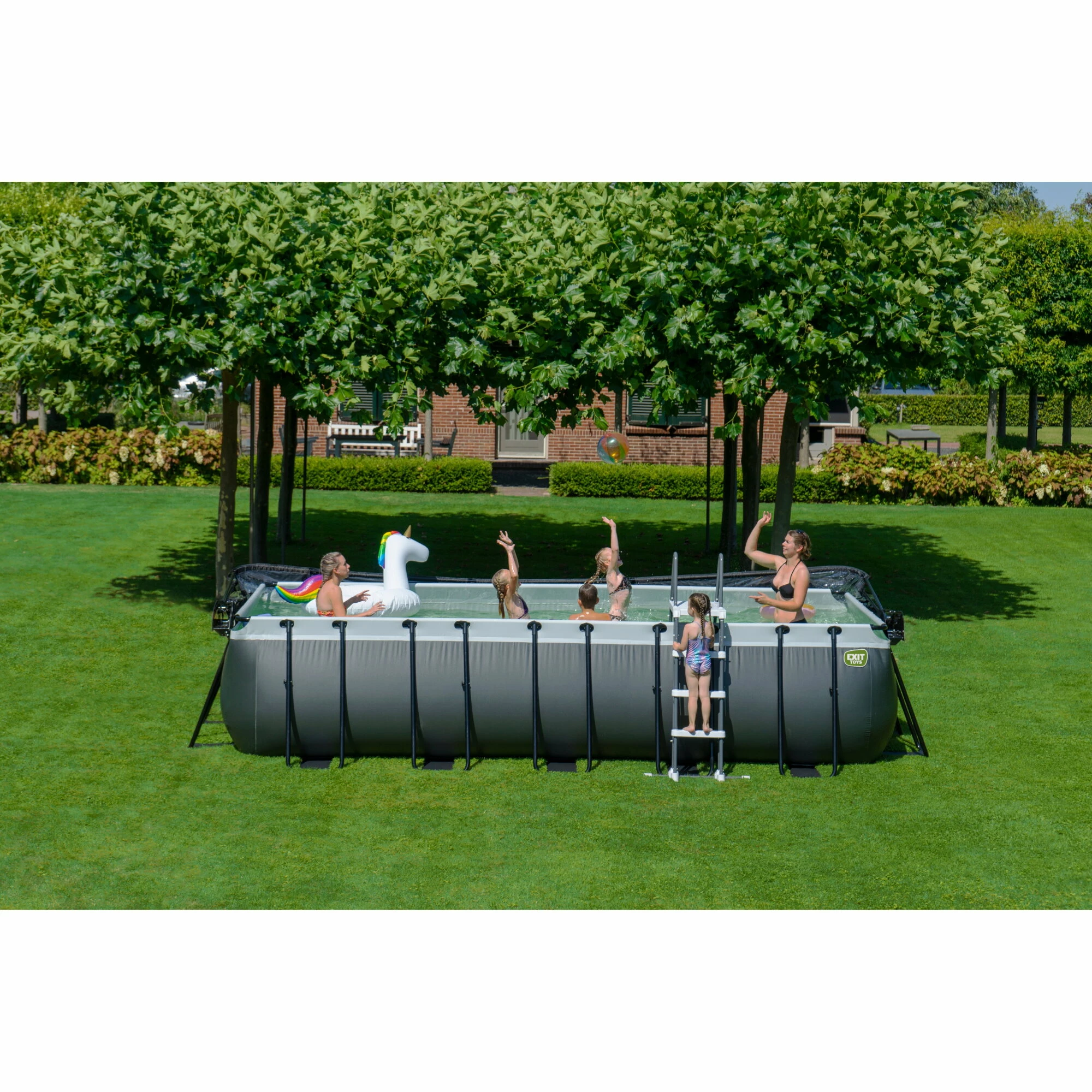 Het EXIT Black Leather zwembad 540 x 250 x 122 cm is een rechthoekig frame zwembad met een zwarte leren print. Dit grote zwembad is standaard voorzien van een zandfilterpomp en een zwembadtrap, waarmee je veilig het zwembad in en uit kunt stappen. Het frame zwembad biedt genoeg ruimte om heerlijk op een luchtbed te dobberen. En wil je toch liever onder water zwemmen? Het EXIT Black leather zwembad is maar liefst 122 centimeter diep waardoor je echt onder water kunt duiken. Met het hoogwaardige frame zwembad van EXIT Toys beleef je gegarandeerd de leukste wateravonturen in je eigen tuin!