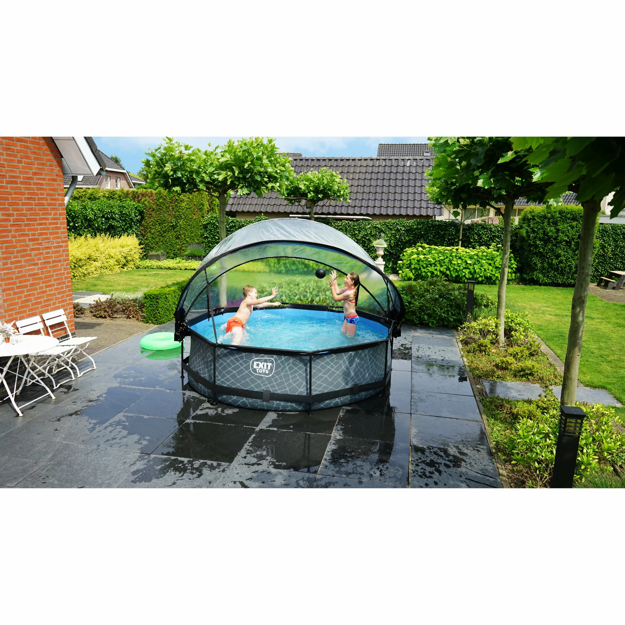 Het stoere houtpatroon en zwarte frame geven het Black Wood zwembad een unieke uitstraling en dankzij de natuurlijke look integreert het zwembad volledig in je tuin. De binnenzijde van het zwembad is blauw, zodat je het frisse zwembad gevoel houdt. De ronde vorm van het zwembad creëert een gezellige sfeer en zorgt ervoor dat je eenvoudig met meerdere personen plezier kunt beleven in je zwembad. Kies voor de zwembaden met overkapping van EXIT Toys, een echte musthave voor in je tuin tijdens de zomer!