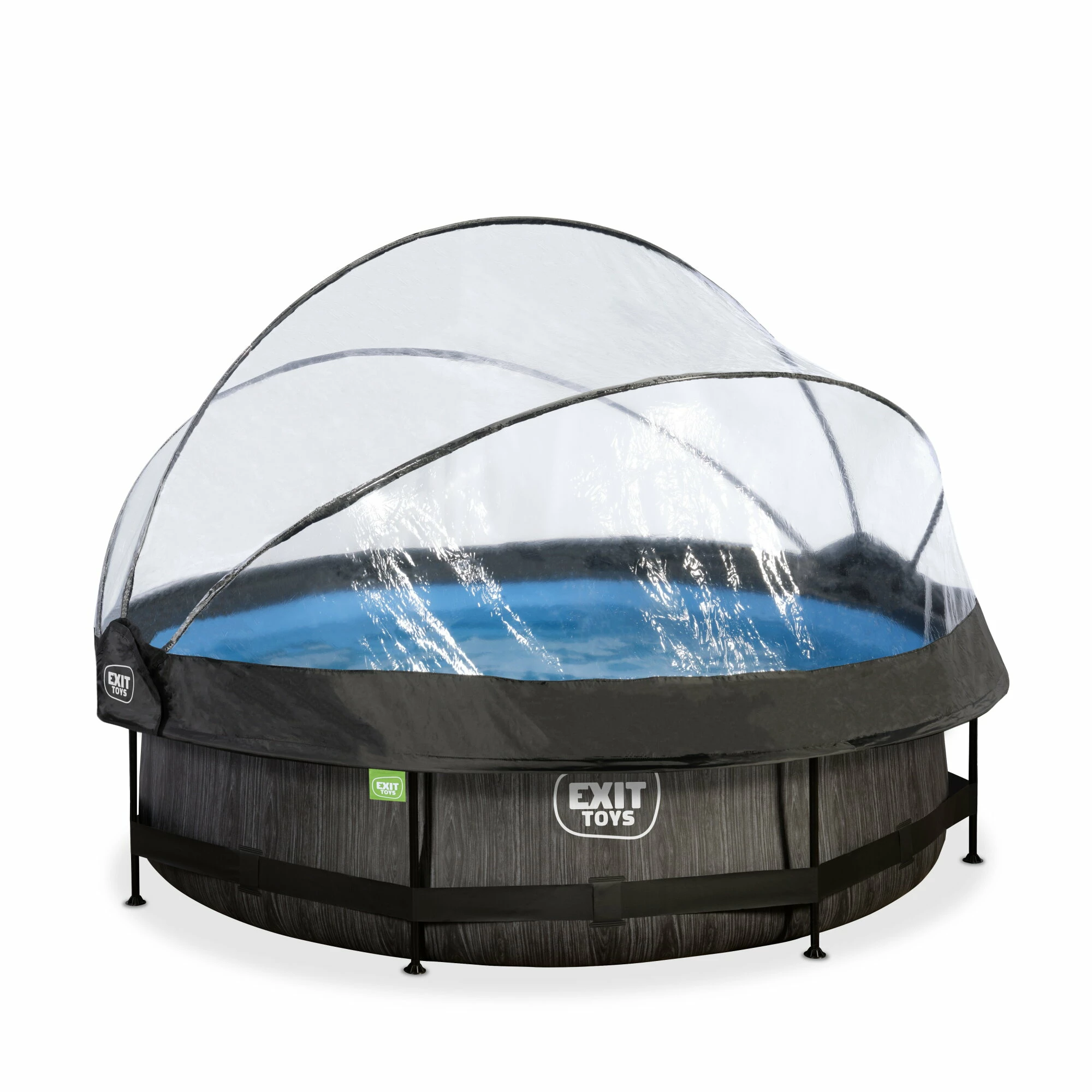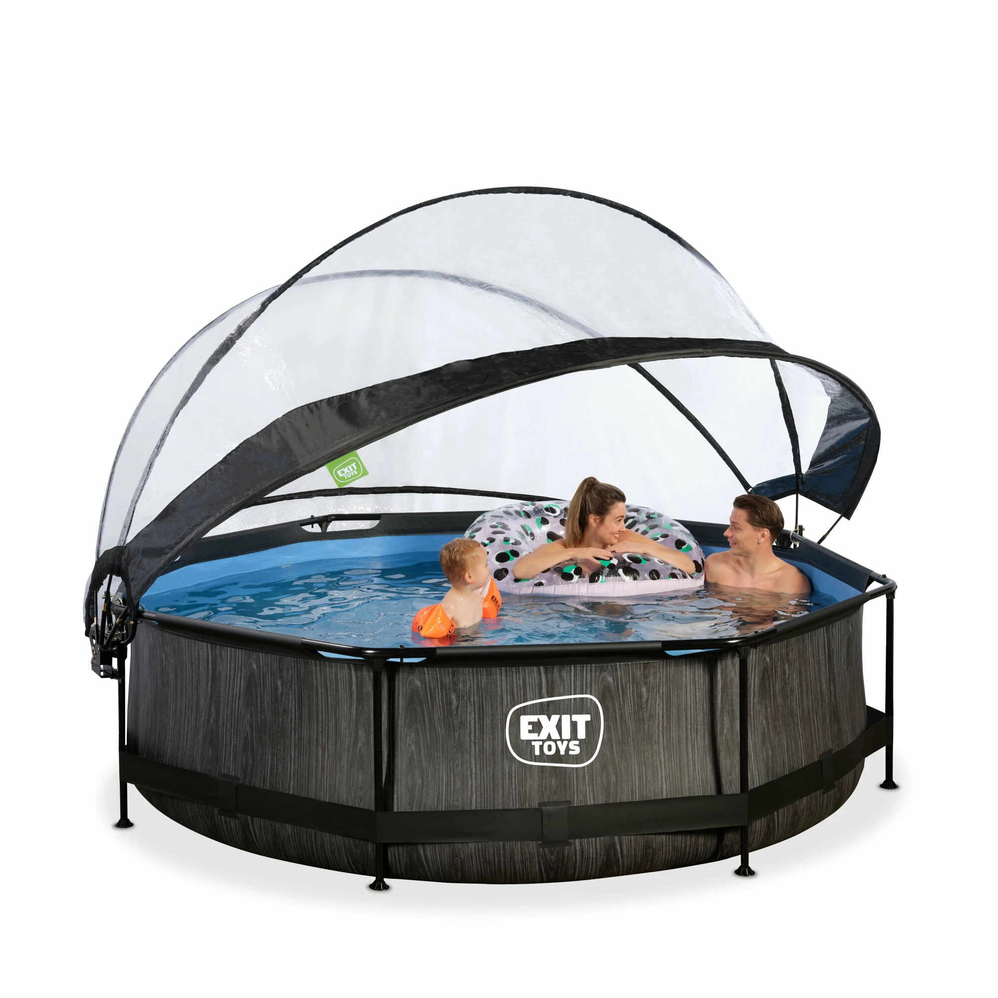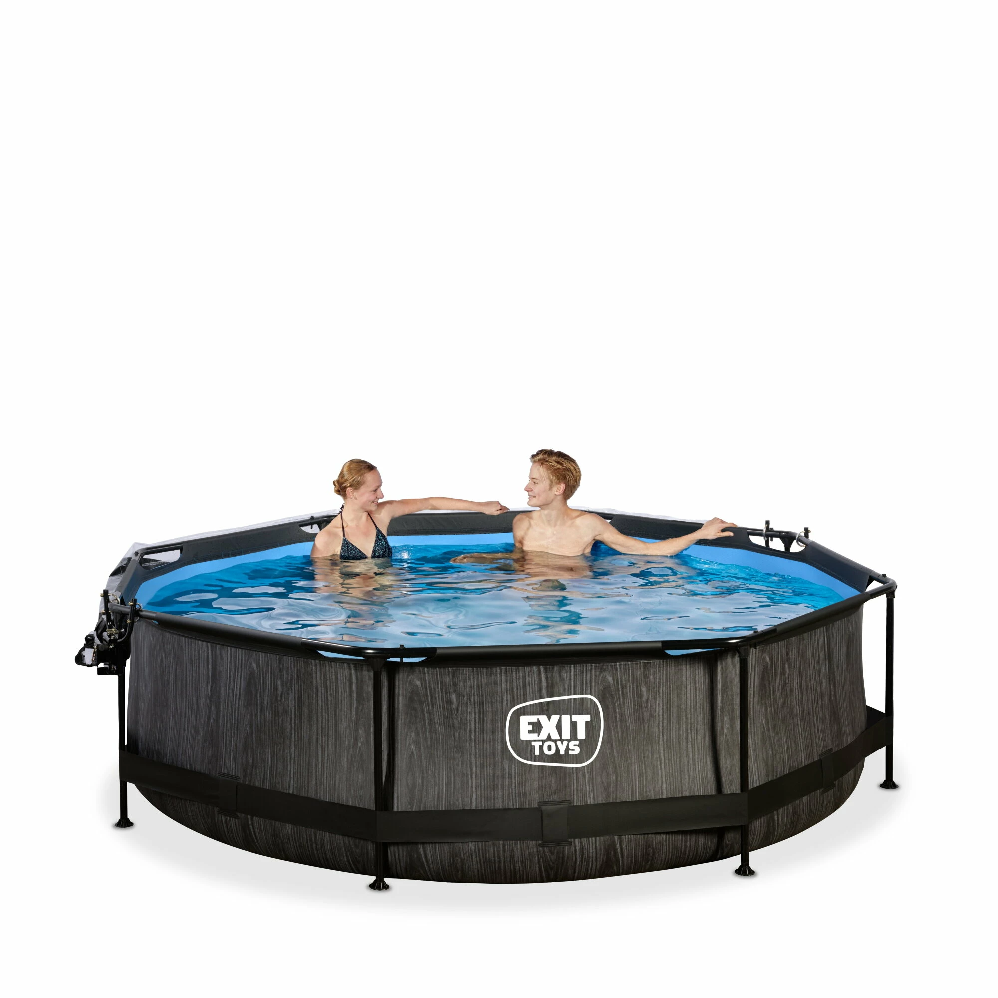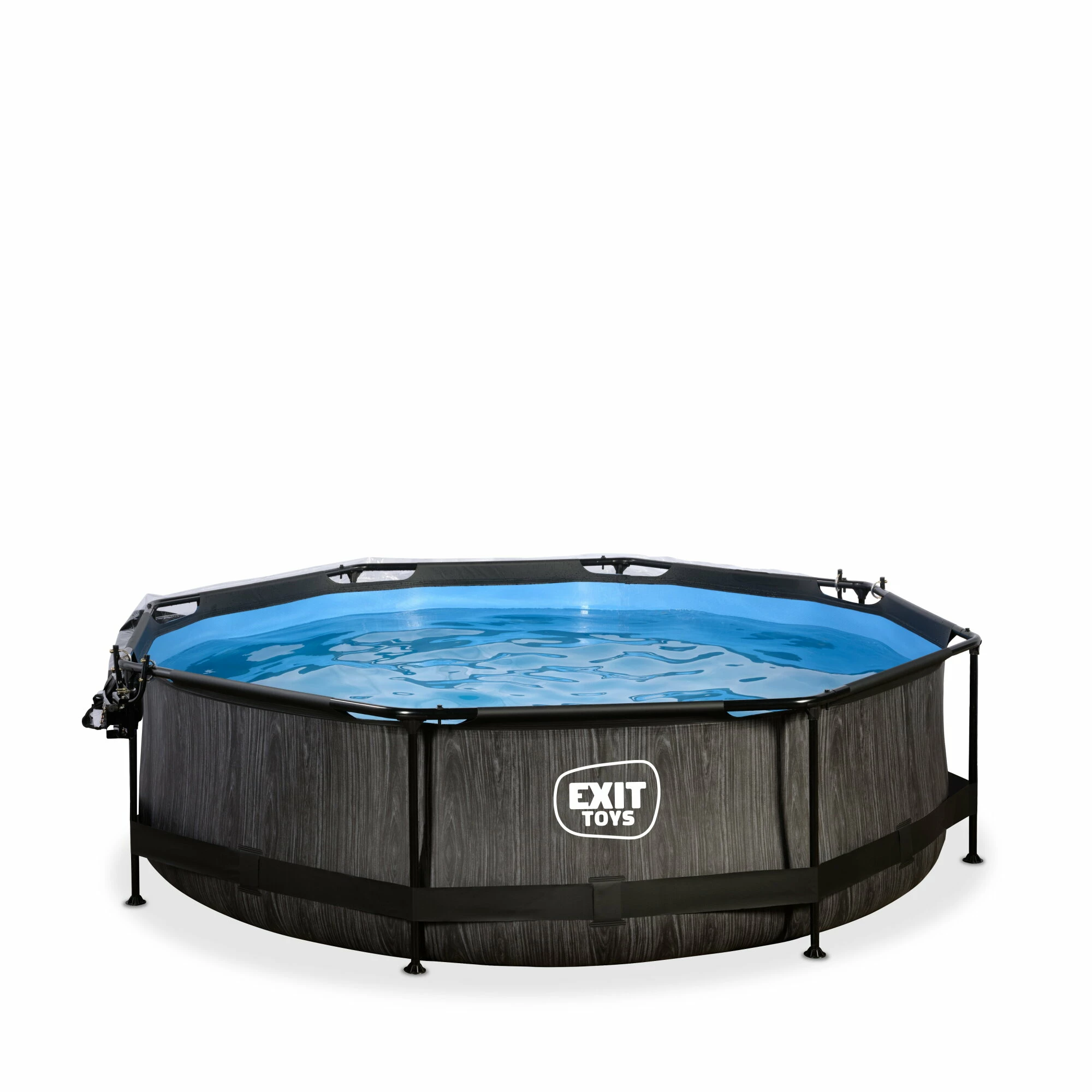 Het EXIT Black Wood zwembad ø300x76cm is een rond frame zwembad met overkapping. Het zwembad is standaard voorzien van een filterpomp en valt op tussen andere zwembaden door zijn stoere donkere houtpatroon. Ben je op zoek naar een leuk en tegelijkertijd uniek en hoogwaardig frame zwembad in je tuin? Steel de show met de ronde zwembaden van EXIT Toys!