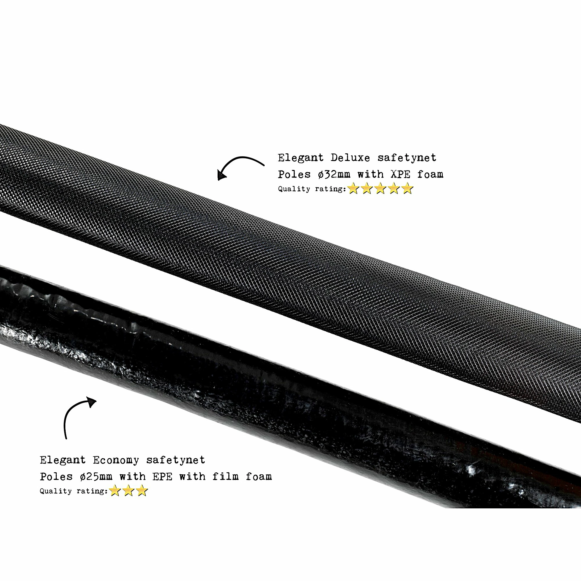 Kies je voor het Deluxe veiligheidsnet, dan kies je niet alleen voor optimale veiligheid, maar ook voor een hoge kwaliteit. Het net staat altijd mooi strakgespannen door glasfiberringen aan zowel de boven- als onderkant. Het veiligheidsnet is hoogwaardig afgewerkt, zelfs bij het extra dikke schuim rondom de palen is dat goed terug te zien.