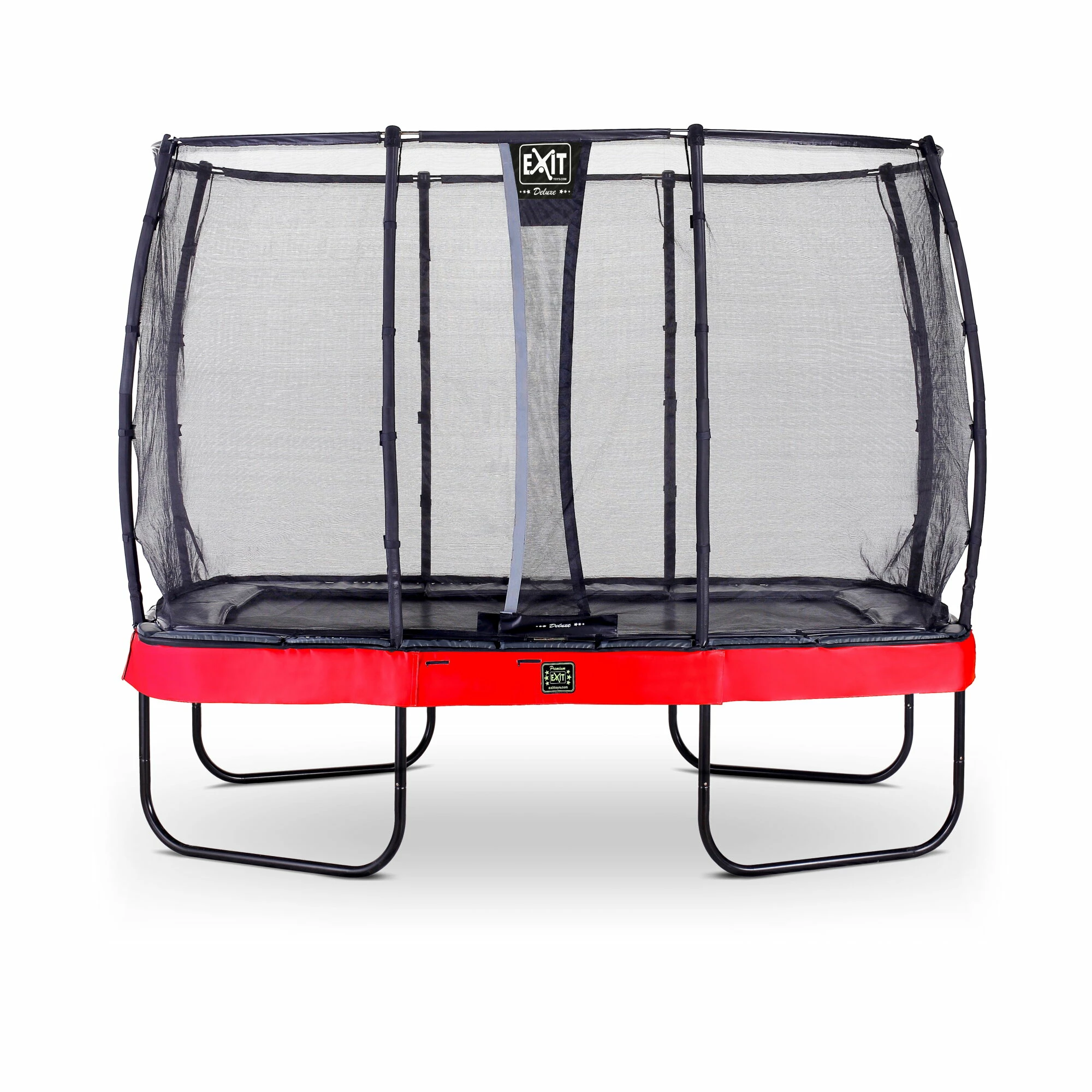 De EXIT Elegant Premium trampoline met Deluxe veiligheidsnet is een rechthoekige trampoline van zeer goede kwaliteit met een grijze beschermrand en een rode rok. Het ijzersterke frame van deze trampoline-serie is eenvoudig op te bouwen. De trampoline is veilig, mooi en ook heel gebruiksvriendelijk. De EXIT Elegant Premium trampoline met het Deluxe veiligheidsnet is een trampoline van absolute topklasse en het paradepaardje binnen de Elegant serie. Maar wat maakt deze trampoline nou zo uniek?
