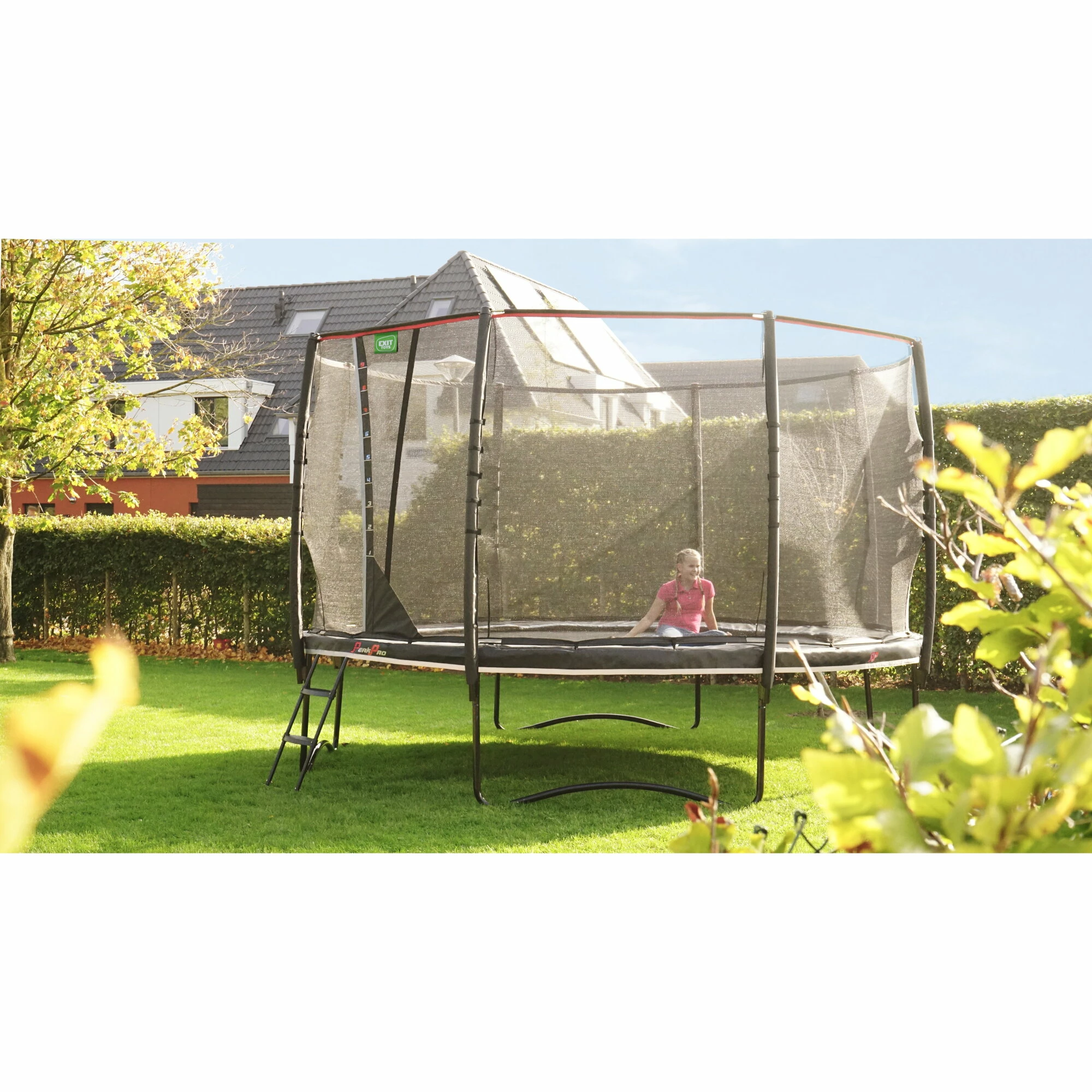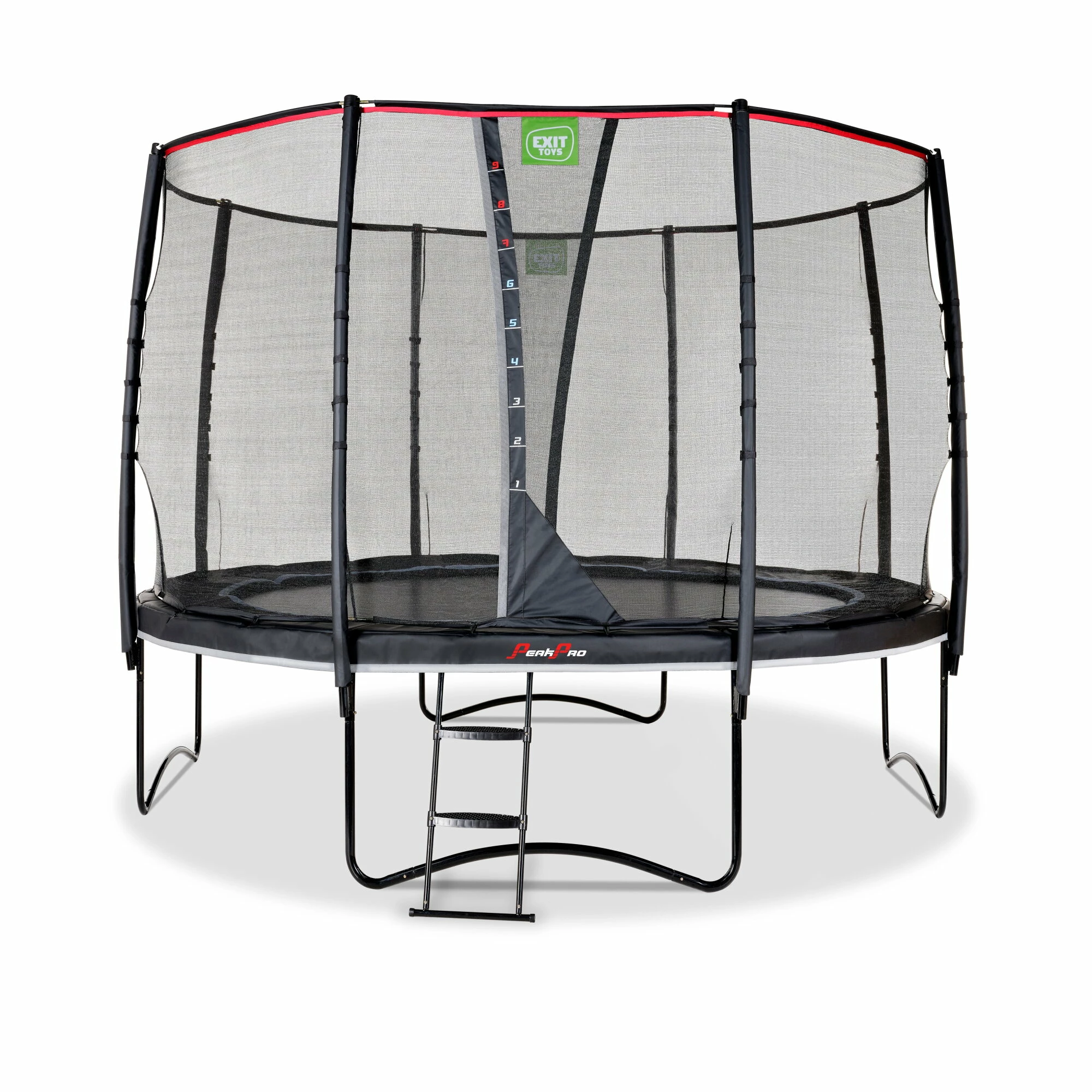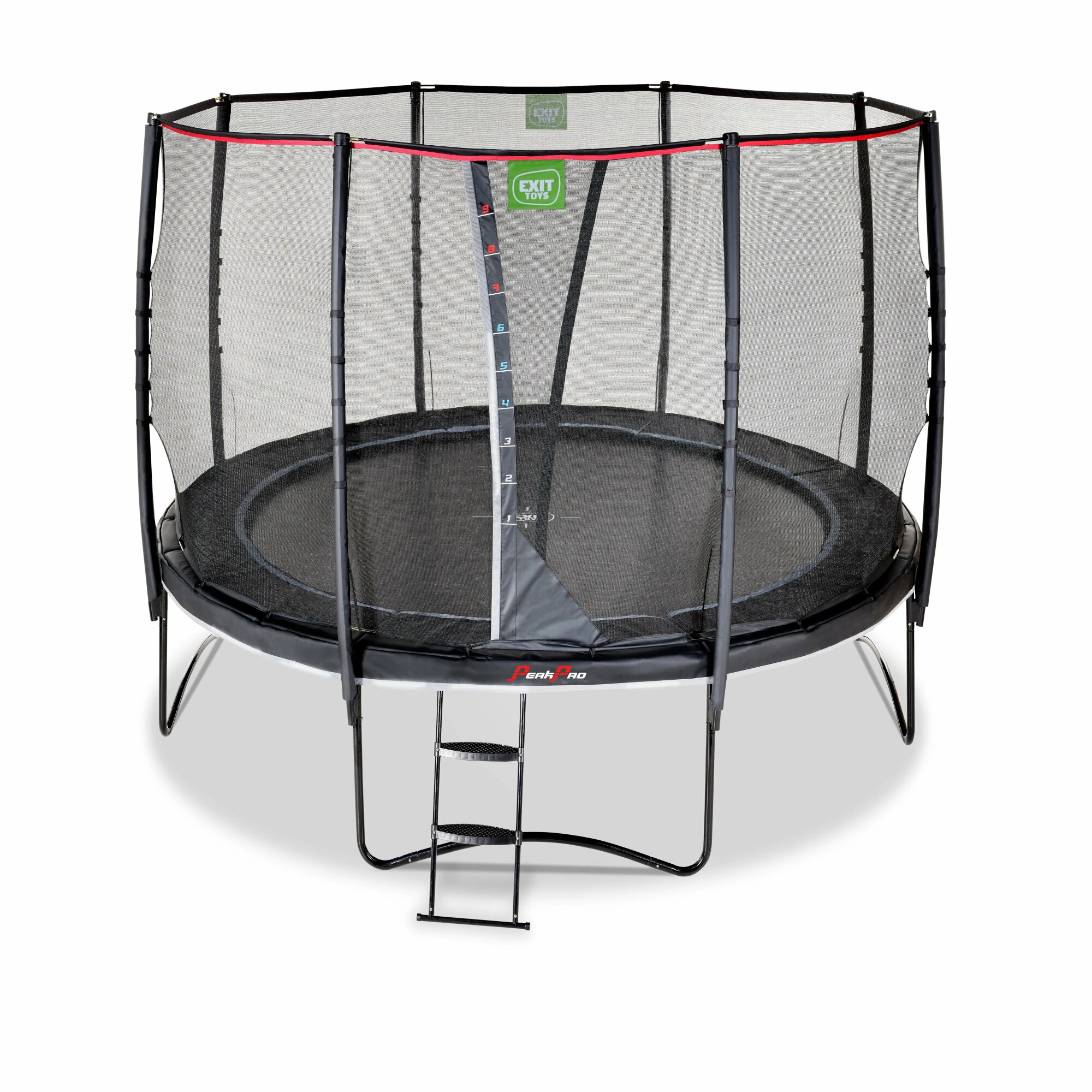 De EXIT PeakPro trampoline met veiligheidsnet is een ronde trampoline met een matzwarte beschermrand en eersteklas springcomfort. De trampoline heeft een robuuste uitstraling door het zwarte frame, de subtiele kleurdetails en reflecterende bies: een pronkstuk in iedere tuin. Bij deze trampoline wordt een trampolineladder meegeleverd zodat je veilig en snel op de trampoline klimt. Met de PeakPro trampoline in de tuin staan kinderen te springen om hun kunsten te laten zien.