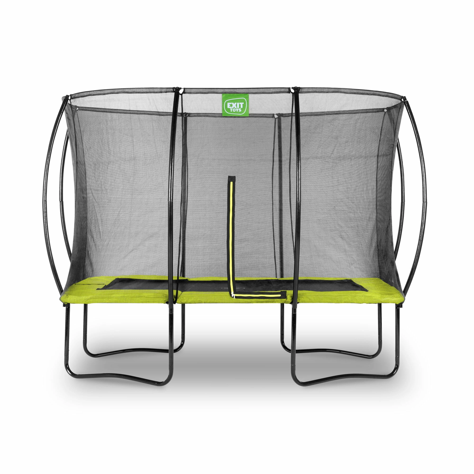 De EXIT Silhouette trampoline op poten is een rechthoekige trampoline met een limoengroene beschermrand. Het veiligheidsnet, dat standaard wordt meegeleverd met de trampoline op poten, is voorzien van gebogen staanders zodat het net strakgespannen staat. Dit is niet alleen extra veilig omdat kinderen niet in het net kunnen blijven hangen, maar het oogt ook rustiger in de tuin. Het veiligheidsnet is voorzien van een fluorescerende groene ritssluiting die goed opvalt, zodat je direct kunt zien of de rits goed is gesloten.