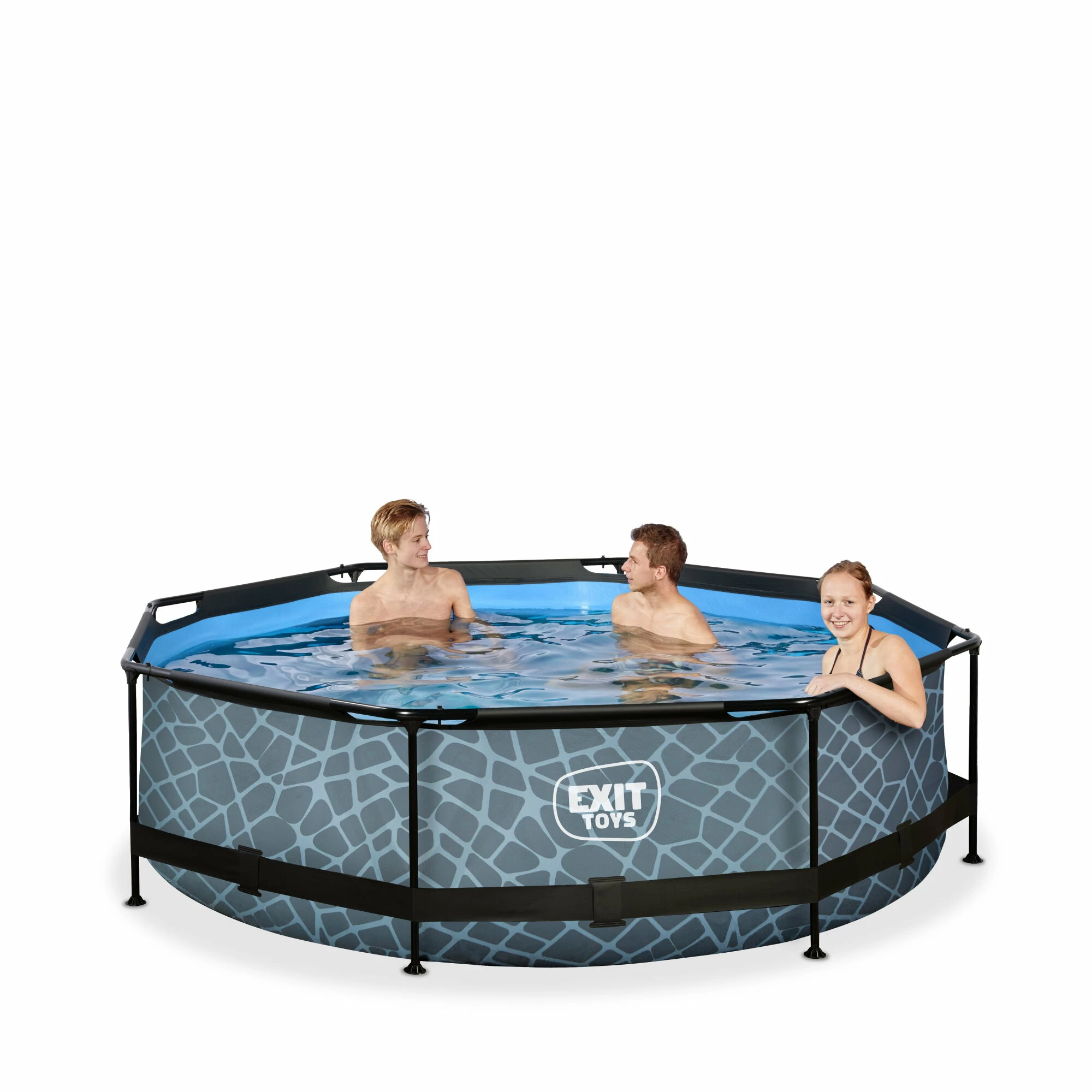 Het stoere steenpatroon en zwarte frame geven het Stone zwembad een unieke uitstraling en dankzij de natuurlijke look integreert het zwembad volledig in je tuin. De binnenzijde van het zwembad is blauw, zodat je het frisse zwembad gevoel houdt. De ronde vorm van het zwembad creëert een gezellige sfeer en zorgt ervoor dat je eenvoudig met meerdere personen plezier kunt beleven in je zwembad. Met de ronde zwembaden van EXIT Toys verveel je je geen moment.
