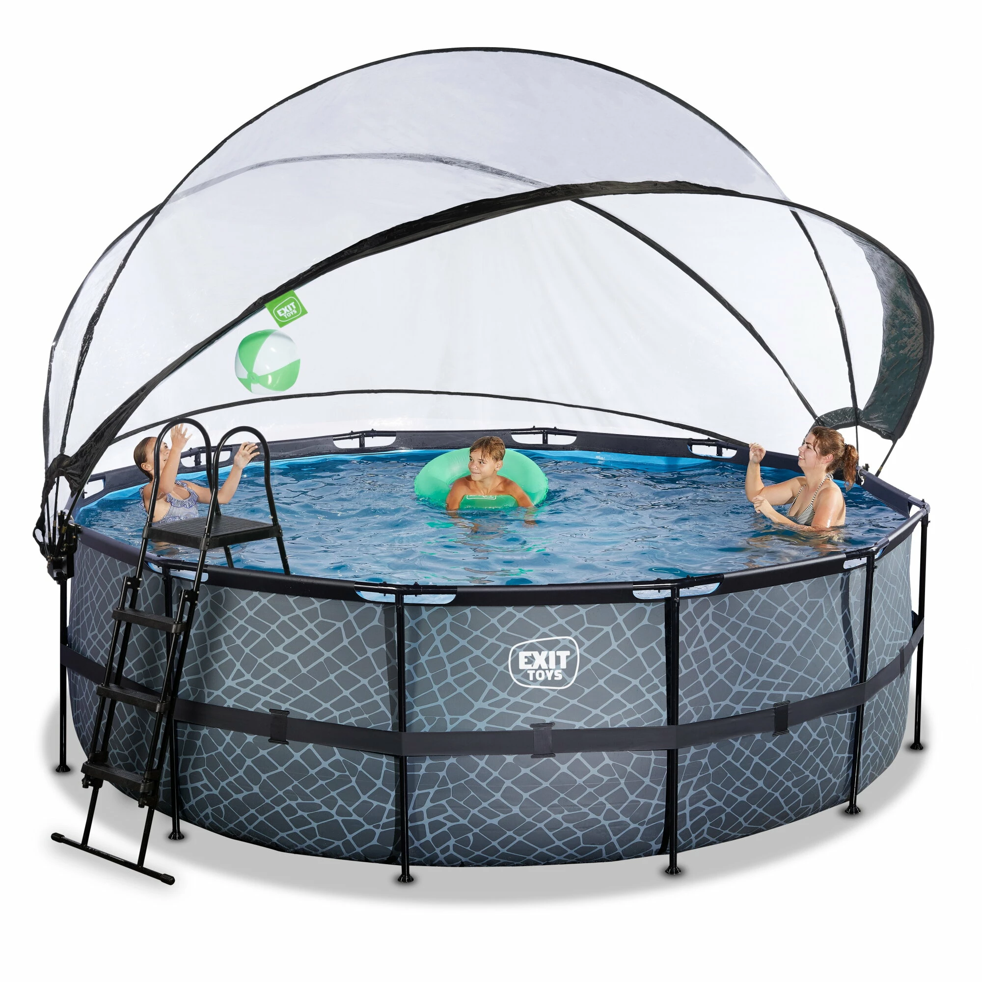 Het EXIT Stone zwembad ø427x 122 cm is een rond grijskleurig frame zwembad met overkapping. Het zwembad is standaard voorzien van een zandfilterpomp en een zwembadtrap, waarmee je veilig het zwembad in en uit kunt stappen. Door de grote diameter van het zwembad is er genoeg ruimte om heerlijk op een luchtbed te dobberen. En wil je toch liever onder water zwemmen? Het EXIT Stone zwembad is maar liefst 122 centimeter diep waardoor je echt onder water kunt duiken. Met het hoogwaardige frame zwembad van EXIT Toys beleef je gegarandeerd de leukste wateravonturen in je eigen tuin!