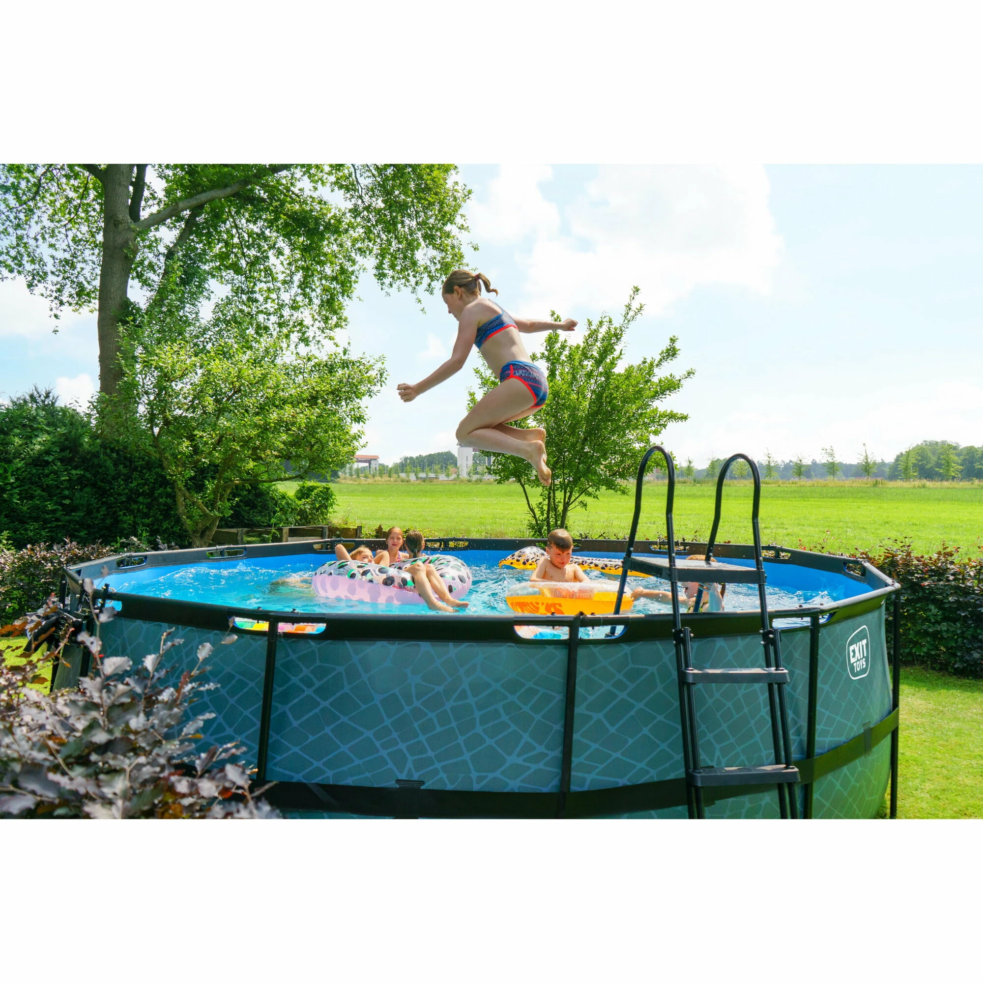 Het EXIT Stone zwembad ø488 x 122 cm is een rond, grijskleurig frame zwembad. Het zwembad is standaard voorzien van een zandfilterpomp en een zwembadtrap, waarmee je veilig het zwembad in en uit kunt stappen. Door de zeer royale diameter en een diepte van maar liefst 122 centimeter beleef je in het zwembad van EXIT Toys een zomerlang zwemplezier met familie en vrienden.