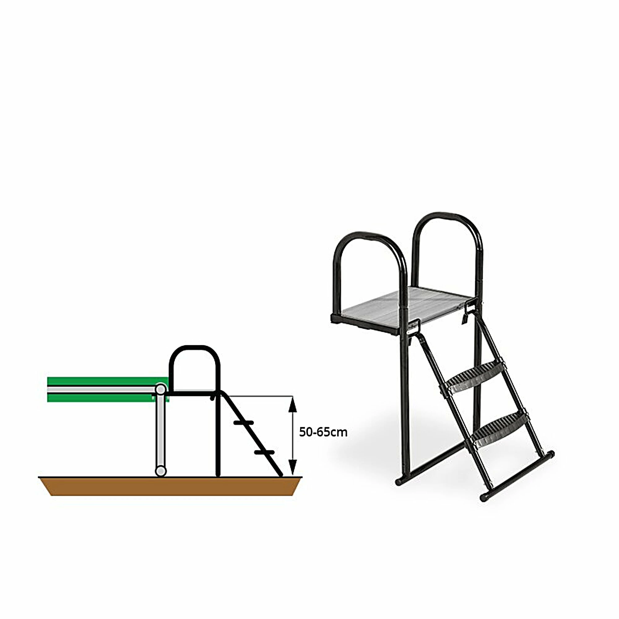 Het EXIT trampoline platform met een trampoline ladder voor framehoogtes tussen de 50 en 65 centimeter is een uitstekend hulpmiddel om op veilige wijze op een trampoline op poten te klimmen. Het platform wordt aan de trampoline bevestigd en de ladder hang je aan het platform, waardoor een prettige opstap naar de trampoline ontstaat.