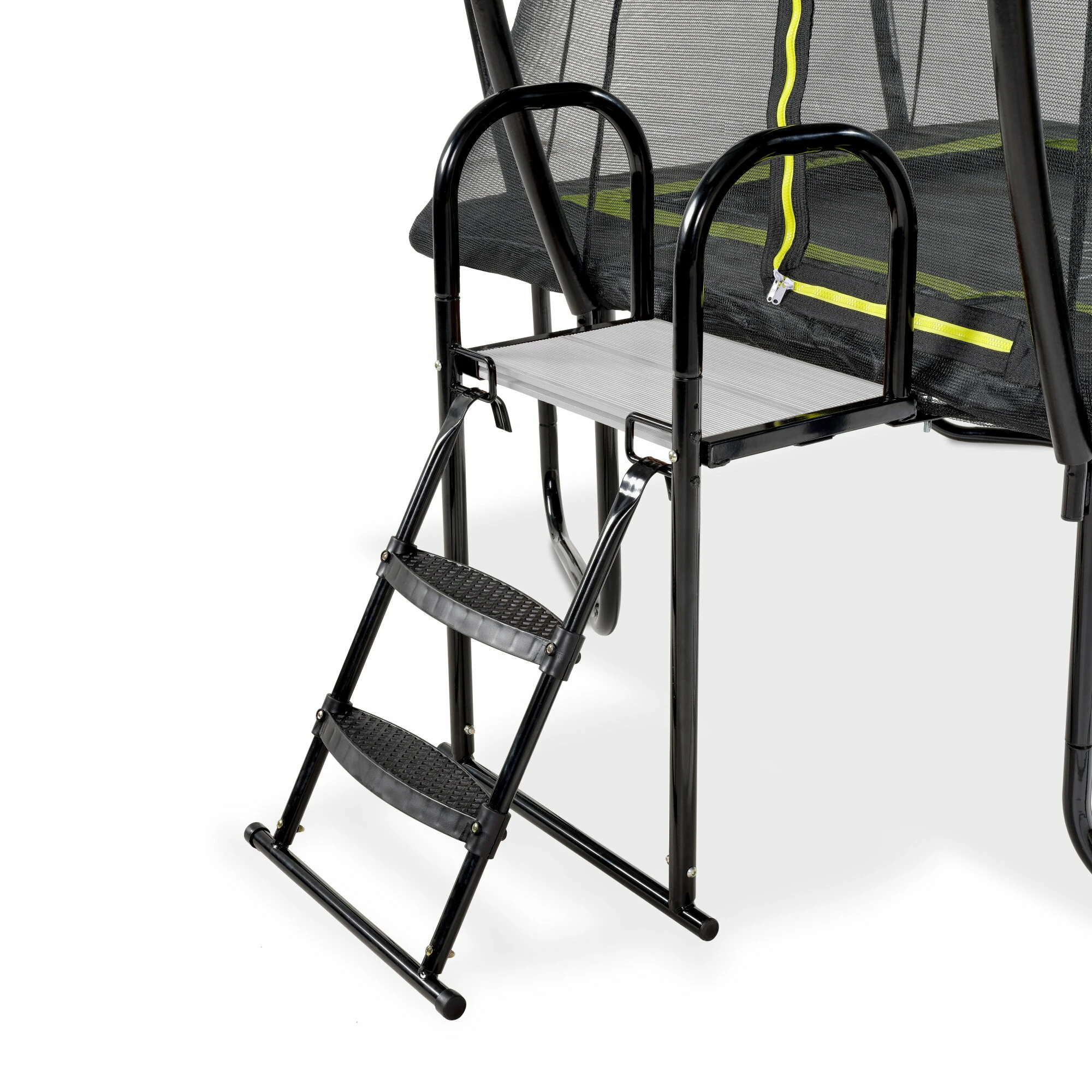Het platform en de ladder hebben brede treden met anti-slip structuur, waar kinderen goed op kunnen staan voor ze door het veiligheidsnet klimmen. Voor extra veiligheid en houvast is het platform aan de zijkanten voorzien van beugels. Deze combinatie van platform ladder is geschikt voor EXIT trampolines met een diameter van 253 en 305 centimeter en voor rechthoekige trampolines met een afmeting van 214 x 305 centimeter.