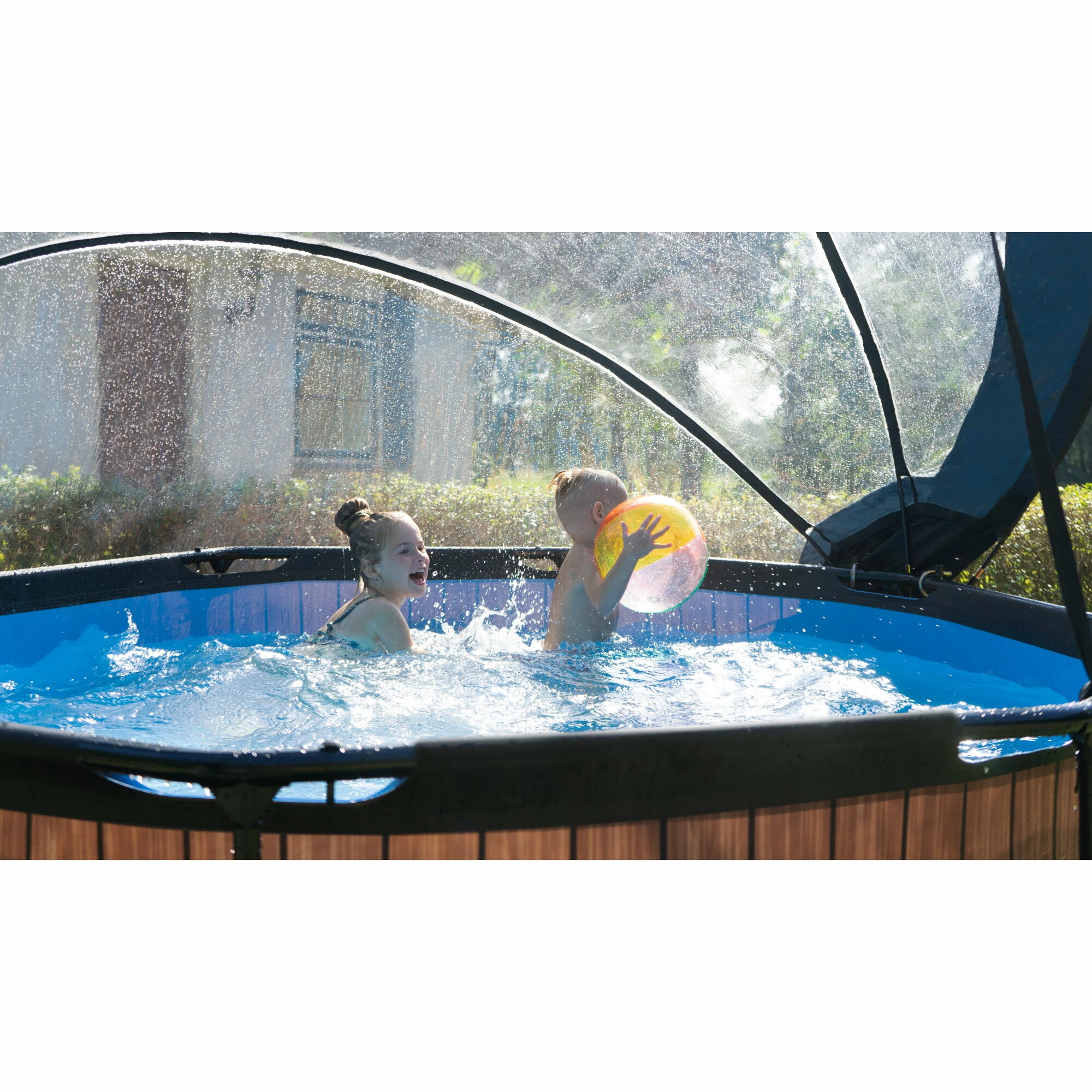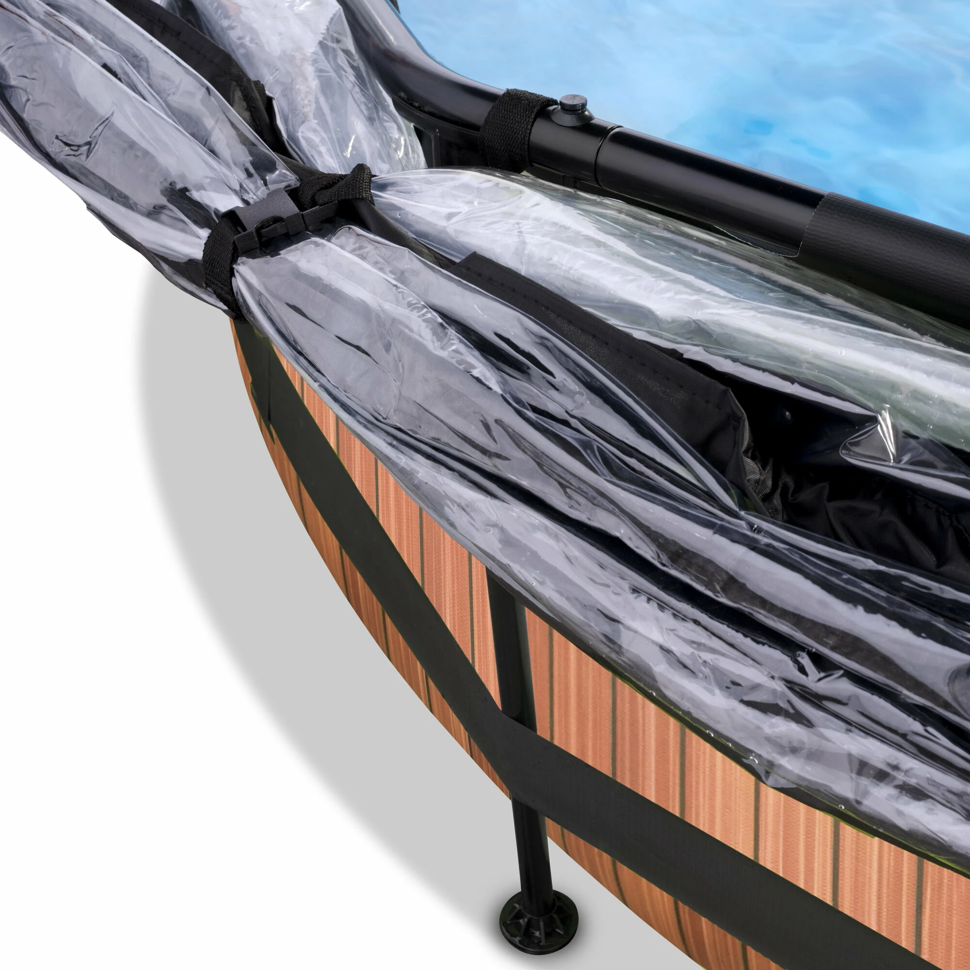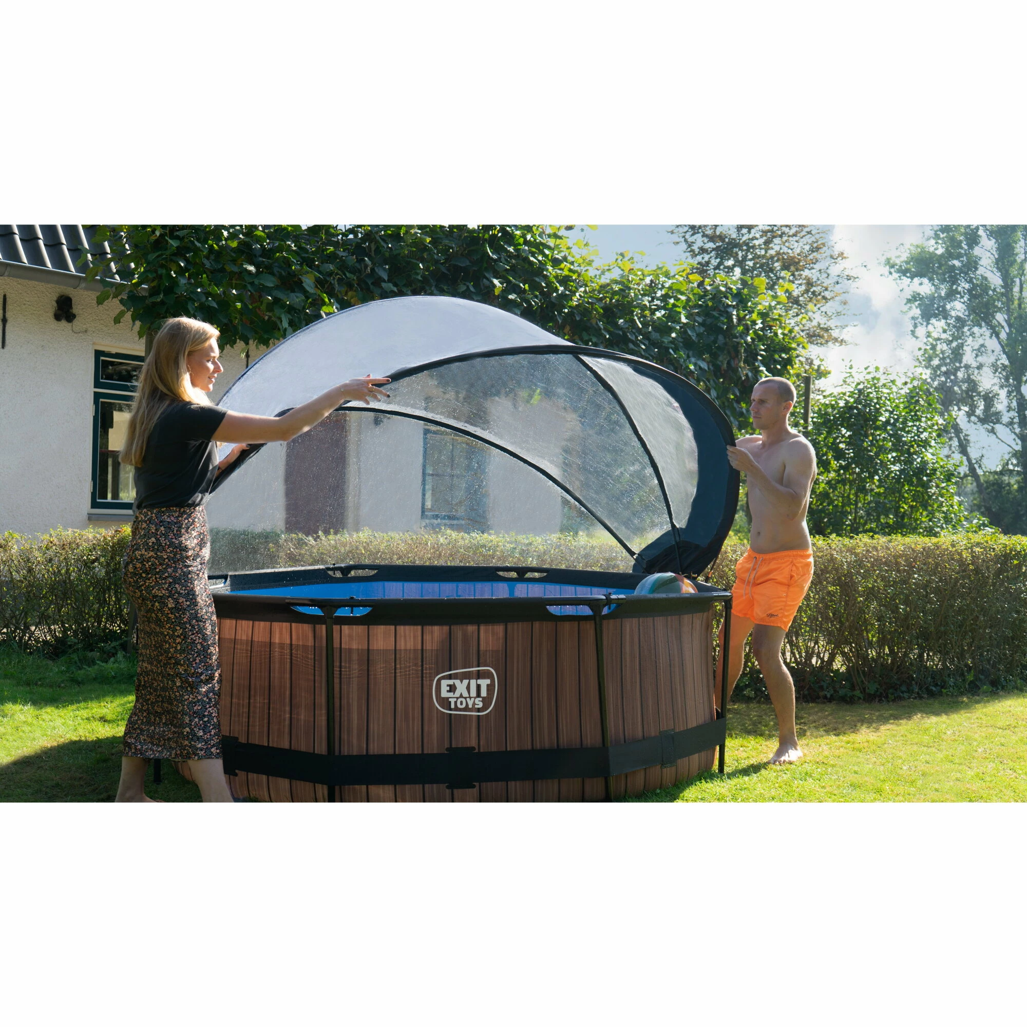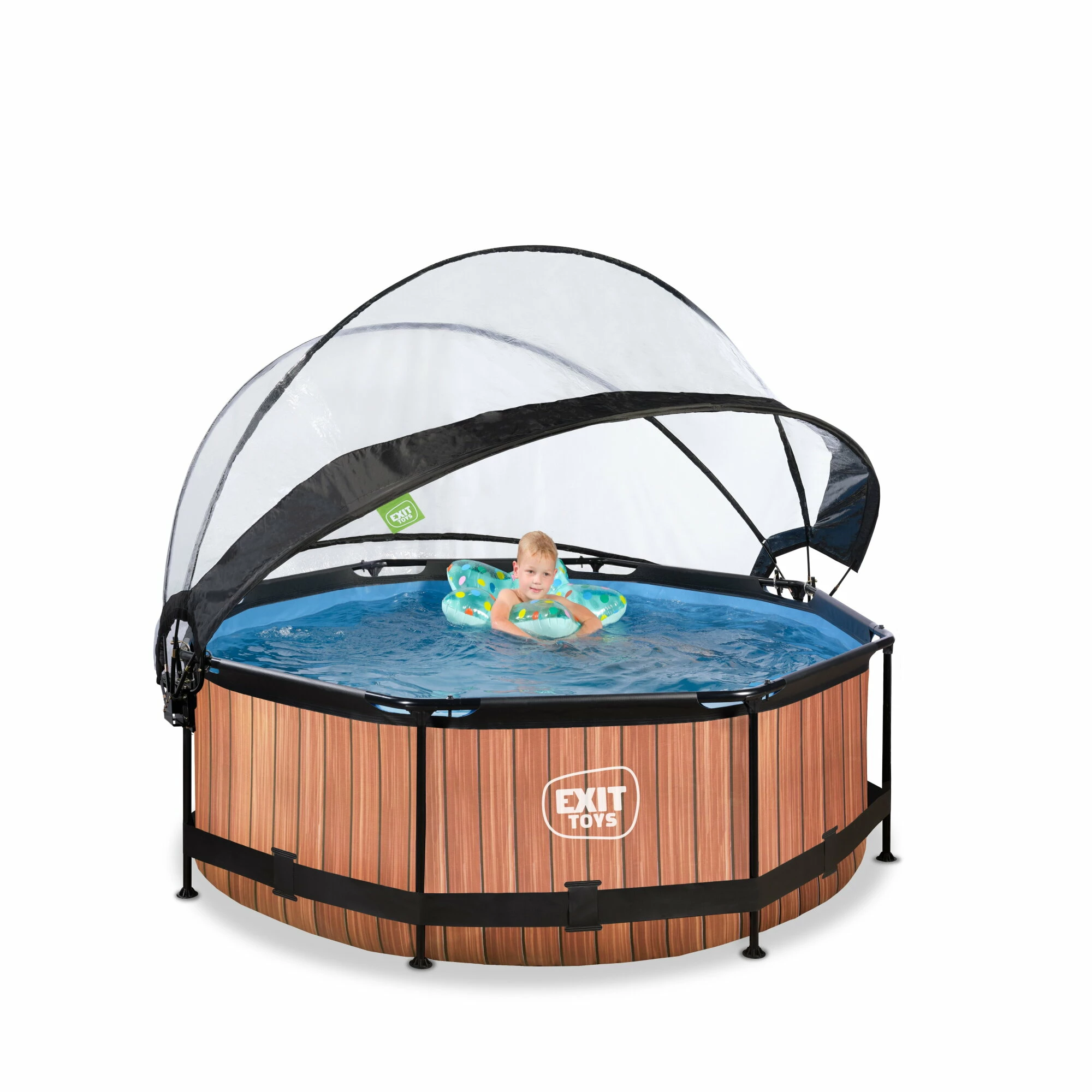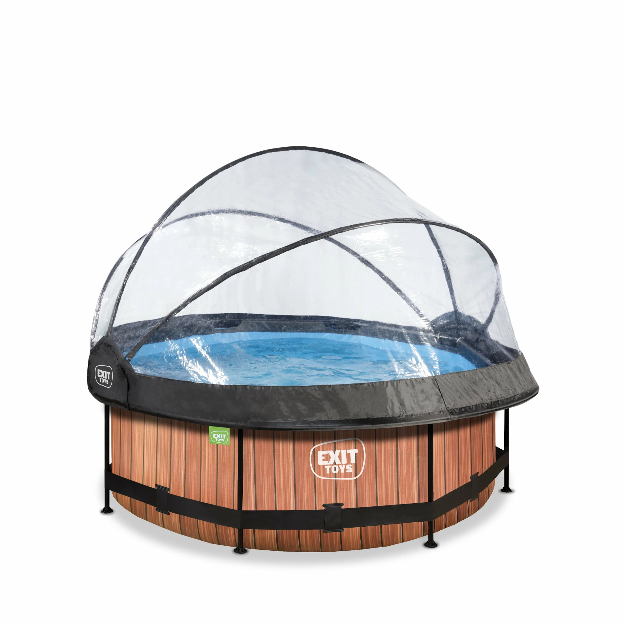 Het EXIT Wood zwembad ø244x76cm is een rond frame zwembad met overkapping. Het compacte zwembad is standaard voorzien van een filterpomp en valt op tussen andere zwembaden door zijn stoere houtpatroon. Ben je op zoek naar een leuk en tegelijkertijd uniek en hoogwaardig frame zwembad in je tuin? Steel de show met de ronde zwembaden van EXIT Toys.