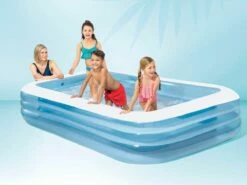 Het Regenboog babyzwembadje van Intex heeft een afmeting van 142 x 119 cm. De regenboog is 84 cm hoog en ziet er niet alleen vrolijk uit maar werkt bovendien als zonnescherm, voor wat extra schaduw. Het kinderzwembadje kan gevuld worden met maximaal 82 liter water. Het badje is gemaakt van 0,25 mm dik vinyl en wordt geleverd met een stukje reparatiemateriaal.