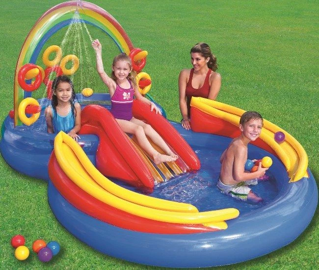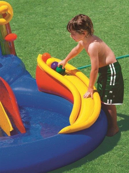 Dit vrolijke, kleurrijke zwembad voldoet echt aan alle voorwaarden voor een onvergetelijke middag! Het zwembad bevat een waterglijbaan en wordt geleverd met een ringspel (met 4 opblaasbare ringen), een bal-rol-spel en een balspel (met plastic speelballen). Dit zorgt voor nog meer speelplezier!