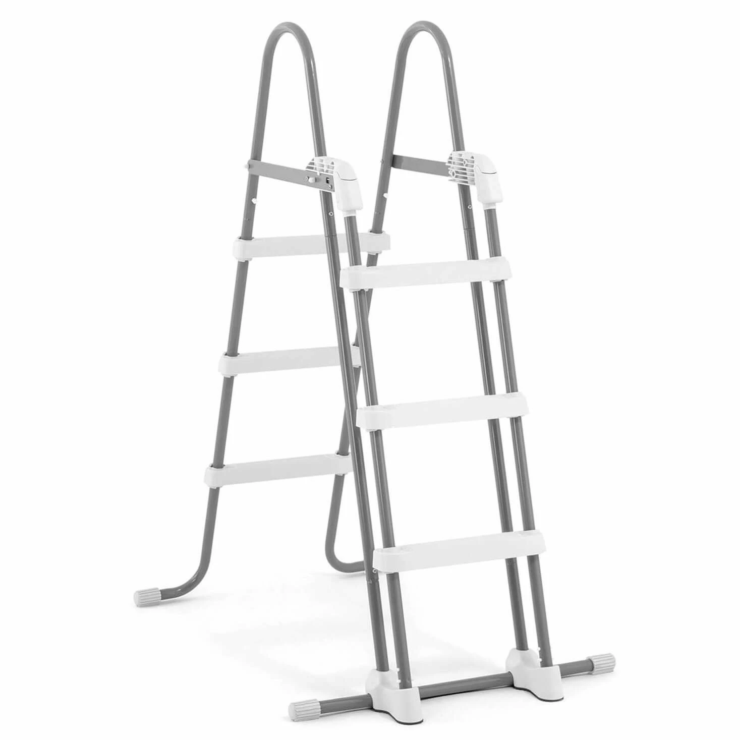 De Intex zwembadtrap bestaat uit een sterk gecoat stalen frame met duurzame kunststof treden. De treden zijn bekleed met anti-slip materiaal zodat je ook met natte voeten zonder uitglijden de ladder op kunt klimmen. Aan de stevige leuningen bovenaan de trap kun je jezelf goed vasthouden. De Intex zwembadtrap kan in elk zwembad worden gezet, opzet- én opblaaszwembaden, zolang de zwembadrand niet hoger is dan 107 cm.